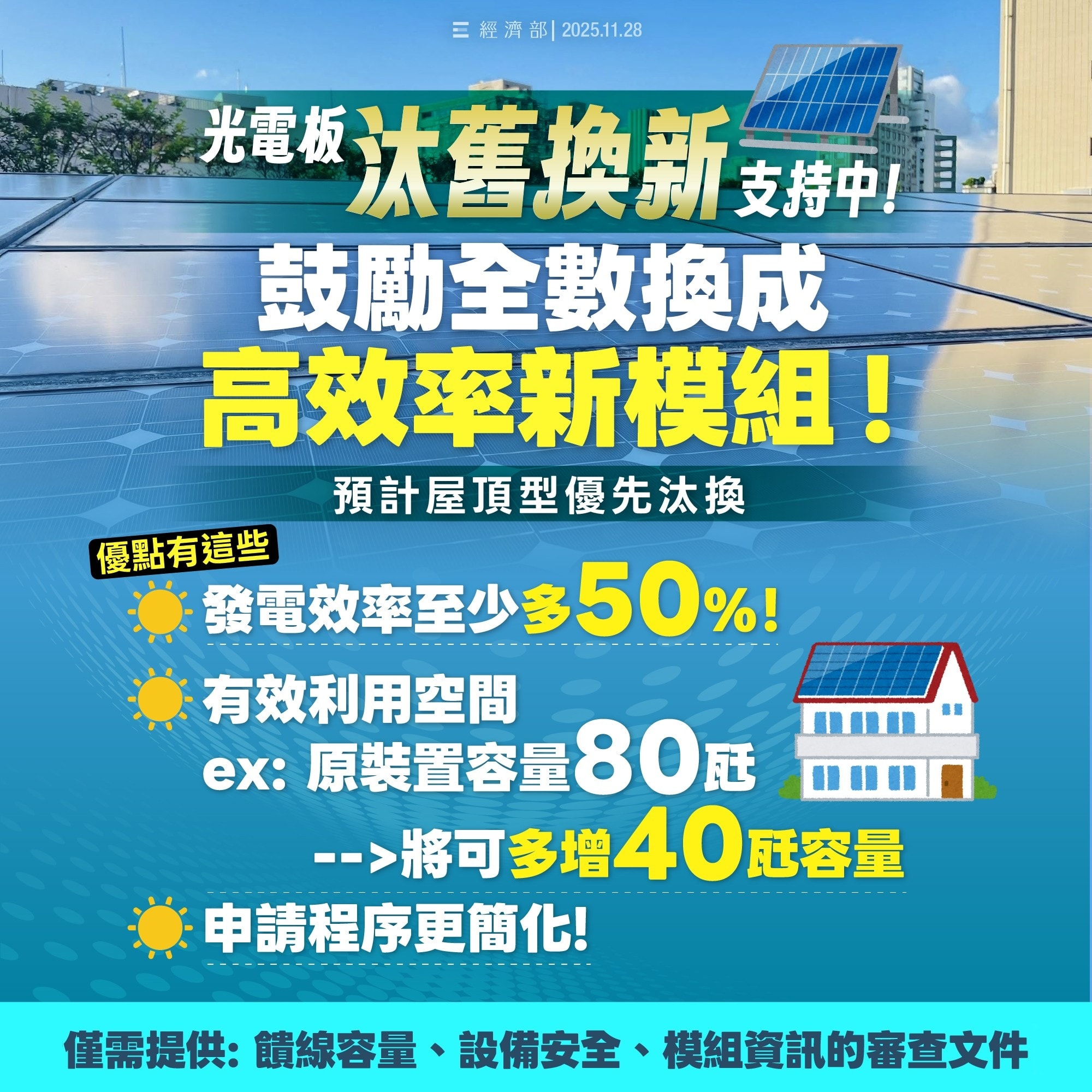 經濟部預計於115年度推動太陽光電汰舊換新機制