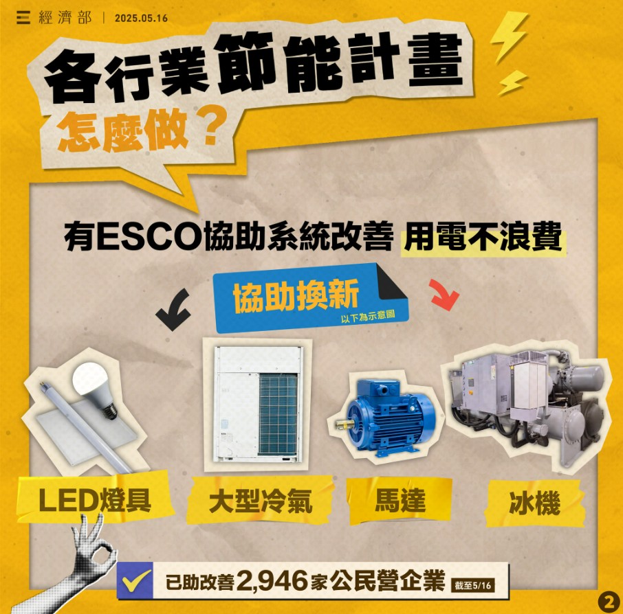 過去一年,政府透過中油、桃園機場等公營事業帶頭示範,擴大至民間企業,設立50億元ESCO專案貸款信保機制,由節能專家: