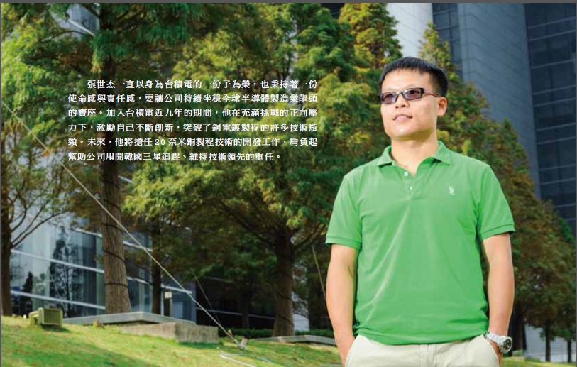 張世杰一直以身為台積電的一份子為榮,也秉持著一份使命感與責任感,要讓公司持續坐穩全球半導體製造業龍頭的寶座。加入台積電近九年的期間,他在充滿挑戰的正向壓力下,激勵自己不斷創新,突破了銅電鍍製程的許多技術瓶頸。未來,他將擔任20 奈米銅製程技術的開發工作,肩負起幫助公司甩開韓國三星追趕、維持技術領先的重任。 |